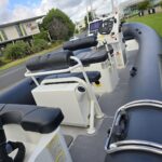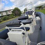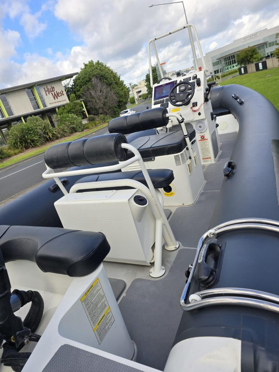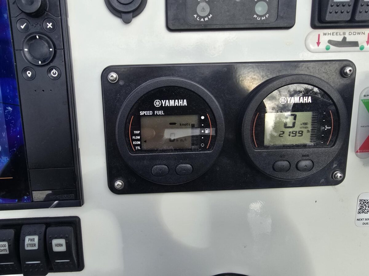 Inboard: Honda – 197 Hours System 40, 3 wheel drive, Diff lock, ABS breaks, Extended run time (XRT) 2x 80L Fuel tanks Simrad NSS Evo3 12” Sounder/Plotter Simrad VHF and Aerial Fusion SRX400 stereo and Speakers Helm seat Centre console with foldable screen Upholstered Console Seat Anchor locker with Upholstered seat Ski Arch with Tow hook and Railblaza mounts with Rodholders Capstan Anchor Winch (James Nielson) Anchor, Chain and Warp Octi U-Dek Bilge Pump Nav Lights Anchor Light Horn USB Charger Cupholders Glovebox Twin batteries